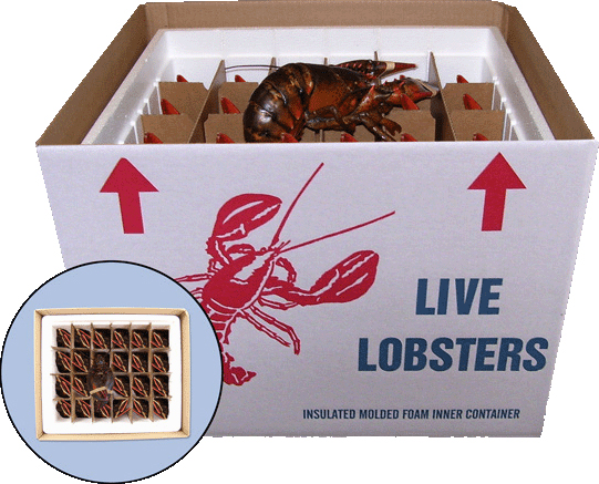 Experience has taught us that live Fresh Lobsters travel best when packed securely in heavy-duty Styrofoam cartons together with gel ice packs before they are sent off to you. So, that's what we do. We also use a more insulated and sturdy box known as a "cloud box". These boxes are very similar to wine boxes including dividers to separate the lobsters in a fashion that they will not touch each other when shipped. We use these especially in the warmer summer months along with extra ice packs to ensure survival and top quality.